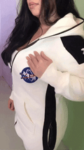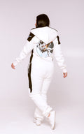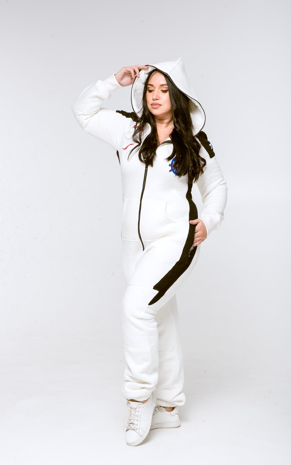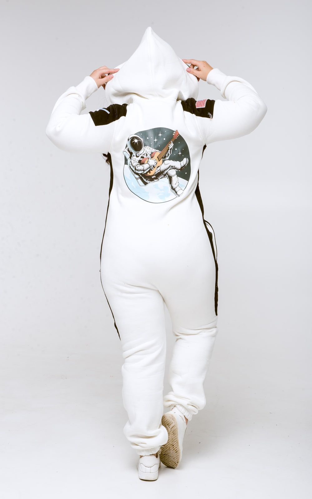 Space jumpsuit is inspired by the boundless expanse of Space. There are several bright color options to choose from - orange, deep blue and white colors. There is a large, dense print on the back that won't crack, peel or fade over time. There are spaceship uniform style patches throughout the jumpsuit.